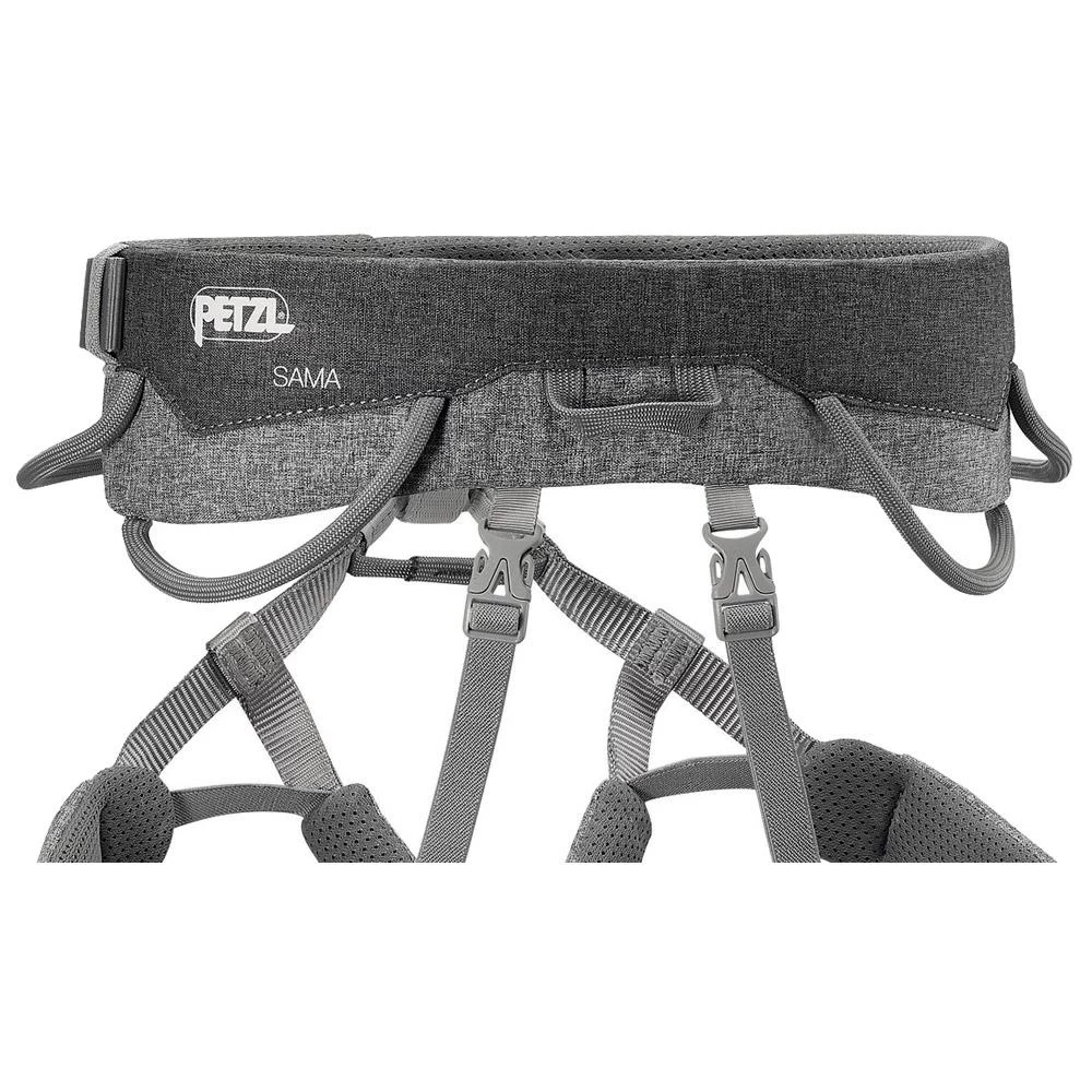 Le Petzl Sama est un harnais léger et agréable à porter. La ceinture est travaillée sur la partie avant pour avoir un maximum de mobilité mais reste épaisse sur l’arrière pour être ultra confortable. Il est doté de tours de cuisses élastiques qui restent bien ajustés et d’un tour de taille réglable avec une boucle. Il est pourvu de quatre porte matériel, deux rigides et deux souples, ainsi que d’un anneau pour sac à pof ou autre.