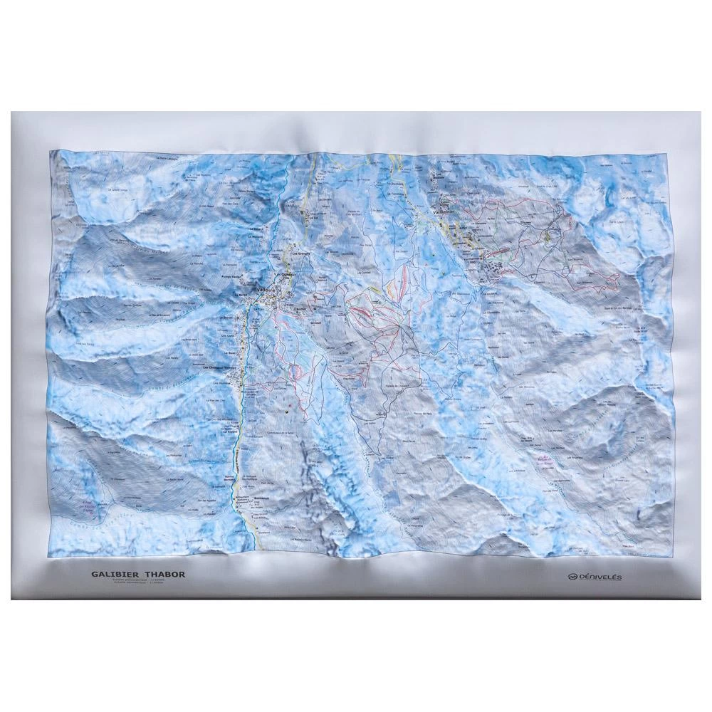 Cette carte Déniveles représente, sur plus de 8 cm de hauteur et en format paysage de 70 cm de large, le domaine skiable de Galibier – Thabor situé en vallée de Maurienne. Dans un ton bleuté très hivernal, retrouvez les 160 km de pistes de ski alpin des deux domaines Valloire et Valmeinier avec le nom de chaque piste, les restaurants, les remontées mécaniques, mais aussi chaque village et chaque hameau. Devenez intouchable sur le domaine de Galibier – Thabor sur cette carte aussi décorative qu’instructive !