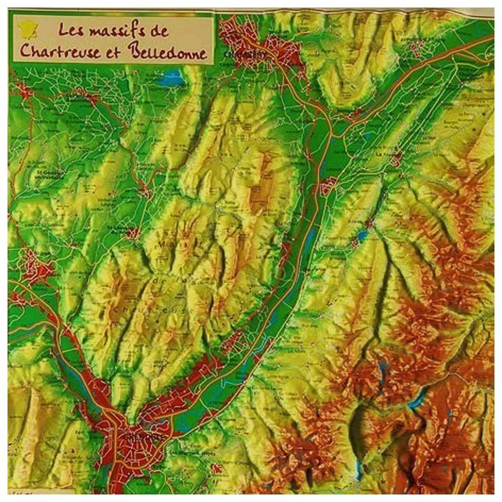 Geo Relief vous présente Les Massifs de la Chartreuse et Belledonne, une carte en relief idéale pour découvrir cette zone entre Isère et Savoie. Plutôt complète, elle présente tous les principaux sommets des deux massifs et les communes avoisinantes. Comprenant des gravures détaillées et des couleur variées pour les différentes hauteurs, cette carte pourra être affichée dans votre maison ou appartement et saura attirer la curiosité de vos amis et de votre famille.