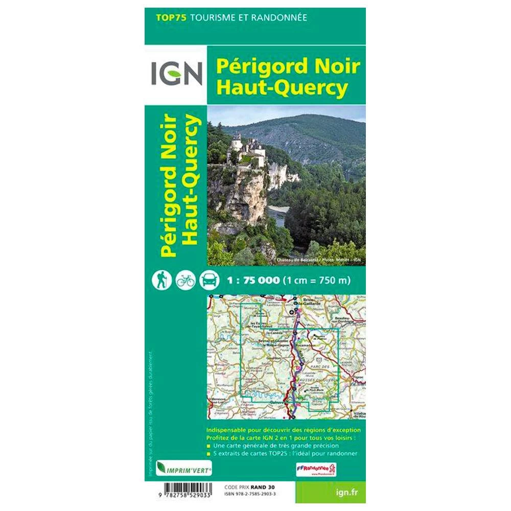 La carte IGN Perigord Noir Haut Quercy vous livre les informations pratiques pour bien vous repérer lors de vos excursions, balades et randonnées. Elle intègre le réseau autoroutier, principal, secondaire et local, mais aussi les pistes cyclables, les GR, des points d’intérêts ou encore les courbes de niveaux.