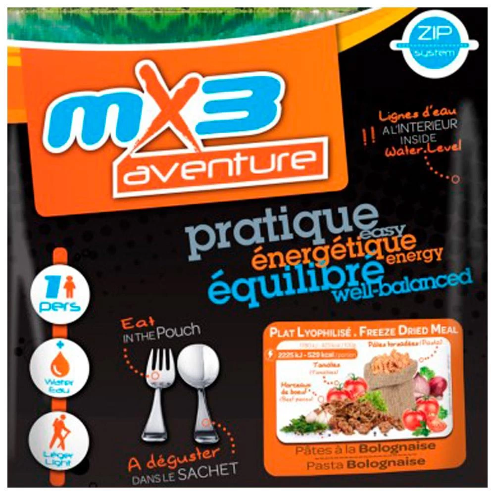 Ce qu’il y a de bien avec les Pâtes à la Bolognaise que la marque MX3 vous propose, c’est le plaisir qu’on a à préparer ce plat. Car s’il peut paraître classique, c’est surtout un incontournable dont on ne se lasse pas. La recette n’est pas un secret : des pâtes, de la viande de boeuf hachée et de la sauce tomate. Voilà de quoi se régaler. Mais avant cela : faites chauffer de l’eau. Lorsqu’elle bout, versez-la dans le sachet, mélangez, puis d’attendre une dizaine de minutes avant de déguster. S’il est délicieux, ce repas lyophilisé est aussi synonyme d’apport d’énergie afin de répondre à vos besoins nutritionnels, quelle que soit l’activité outdoor pratiquée.